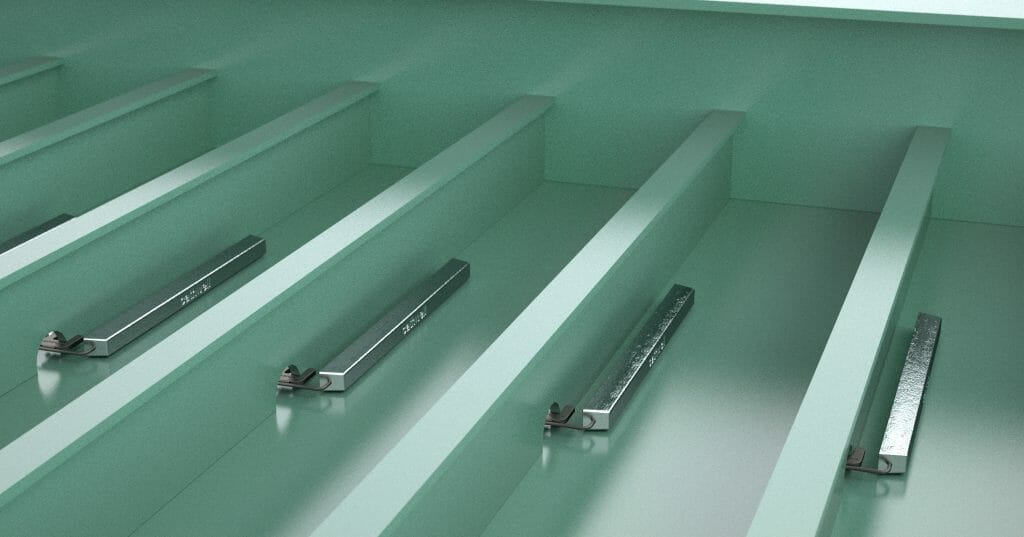 In ballast tanks, zinc anodes are sometimes used, though aluminum anodes are often preferred due to their technical and economic advantages. However, aluminum anodes may pose a risk of sparking if they detach.